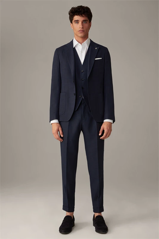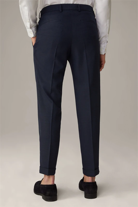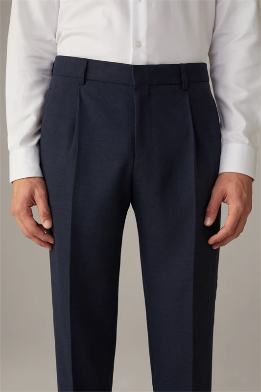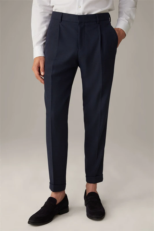 Mit klassischen Bund- und Bügelfalten, Hakenverschluss sowie fixierten Beinumschlägen begeistert die Baukasten-Hose Luis als eleganter Allrounder. Ein fein strukturierter Woolmix rundet das Design luxuriös ab.
