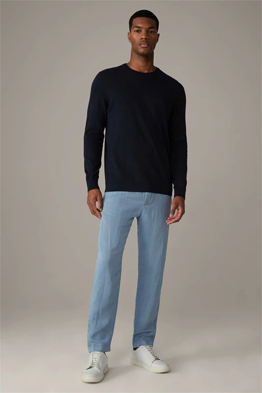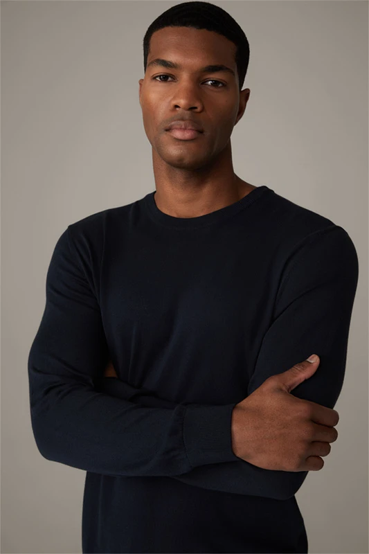 Comfy Styling-Piece für moderne Kombis: der Pullover Vincent aus feiner, purer Baumwolle. Rundhalsausschnitt und breite Rippbündchen an den Ärmeln ergänzen relaxte Details.