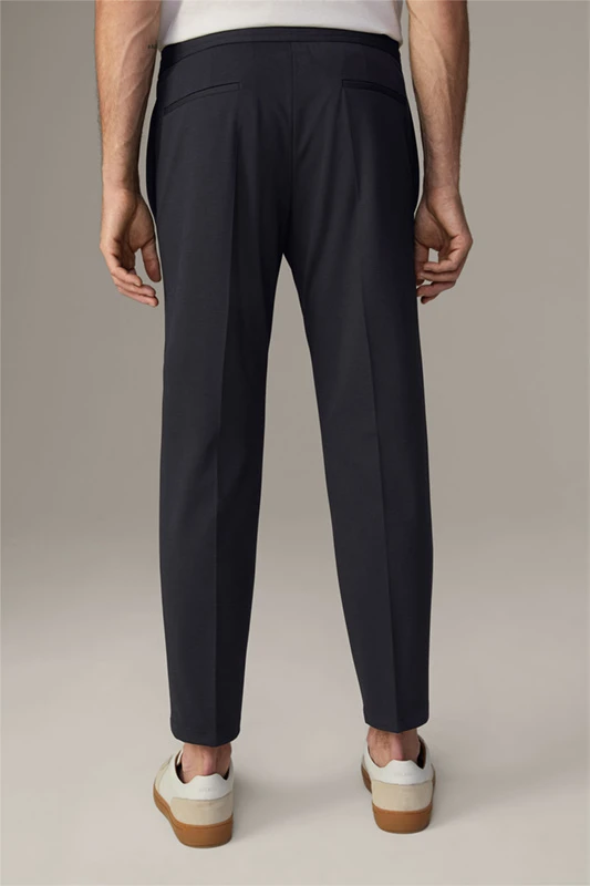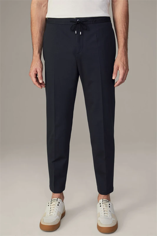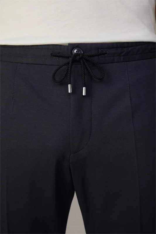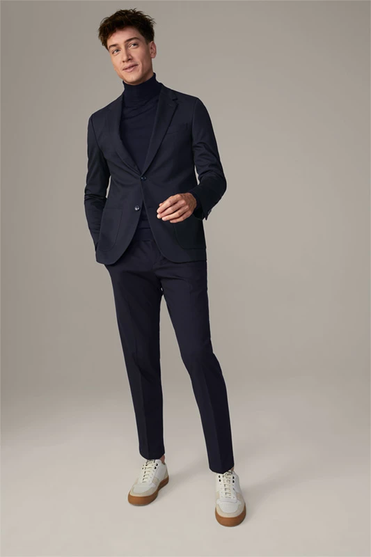 Die Hose Saturn überzeugt mit einer modernen Tech-Qualität im SLIM FIT mit schmalem Beinverlauf und einem Bund mit sportivem Tunnelzug-Element, ergänzt durch klassische Eingriff- und Gesäßtaschen – passend zum Sakko Arndt.